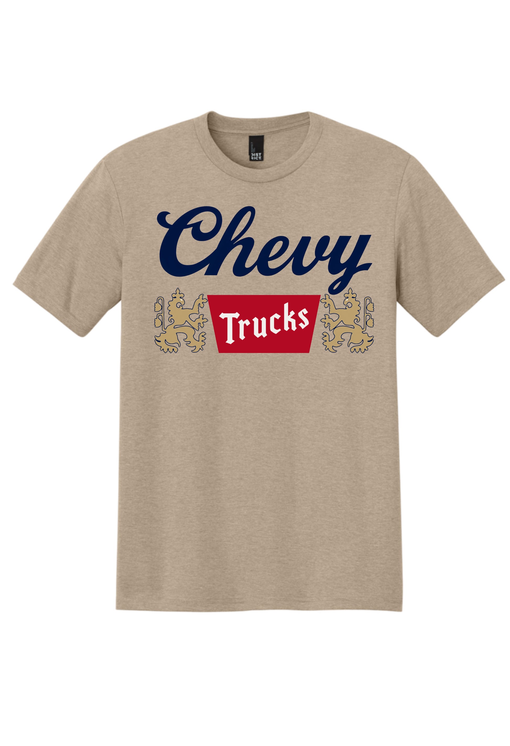 Coors Banquet Chevrolet on the front, navy Tristar logo on the upper back desert Tan Heather District triblend shirt